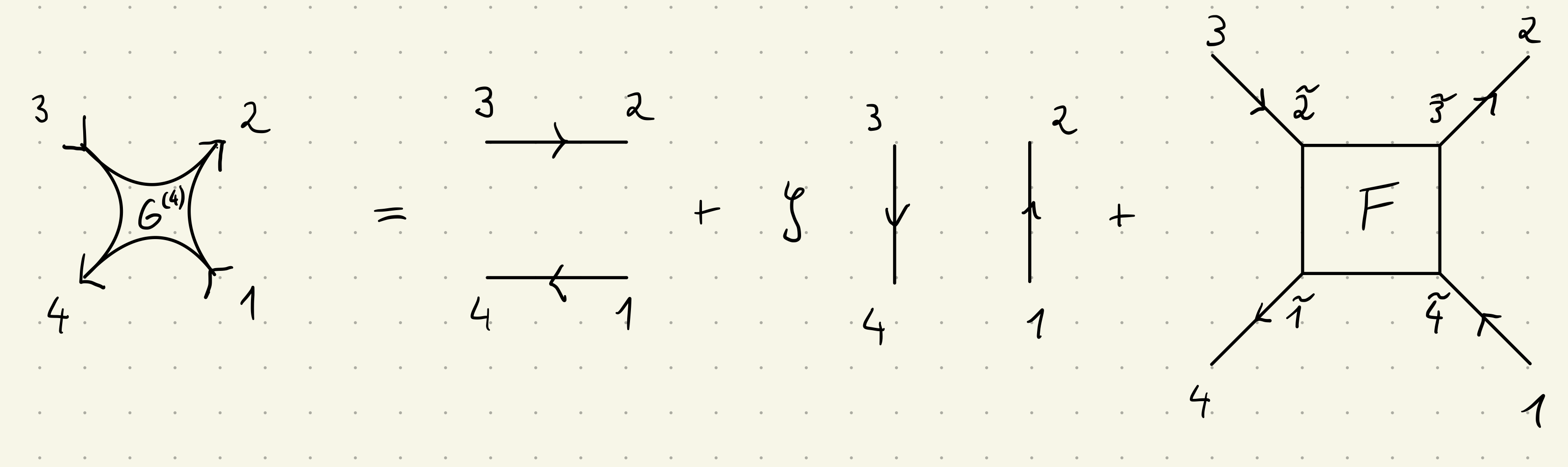 \end{align} G 4321 ( 4 ) = G 41 G 23 + ζ G 43 G 21 + G 4 1 ~ G 2 3 ~ F 1 ~ 2 ~ 3 ~ 4 ~ G 2 ~ 3 G 4 ~ 1 . The third term, G c , 4321 ( 4 ) = G 4 1 ~ G 2 3 ~ F 1 ~ 2 ~ 3 ~ 4 ~ G 2 ~ 3 G 4 ~ 1 G^{(4)}_{c,4321} = G_{4\tilde{1}} G_{2\tilde{3}} F_{\tilde{1}\tilde{2}\tilde{3}\tilde{4}} G_{\tilde{2}3} G_{\tilde{4}1} G c , 4321 ( 4 ) = G 4 1 ~ G 2 3 ~ F 1 ~ 2 ~ 3 ~ 4 ~ G 2 ~ 3 G 4 ~ 1 is also called the connected four point correlator . This expression defines the full four-point vertex F F F .